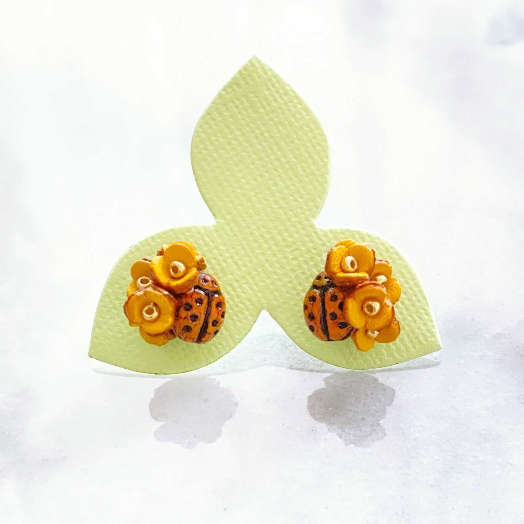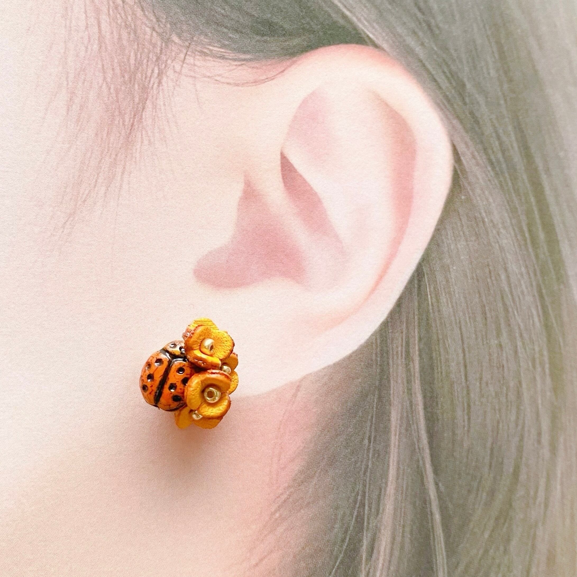 *てんとう虫とお花のピアス/イヤリング(オレンジてんとう虫)*
