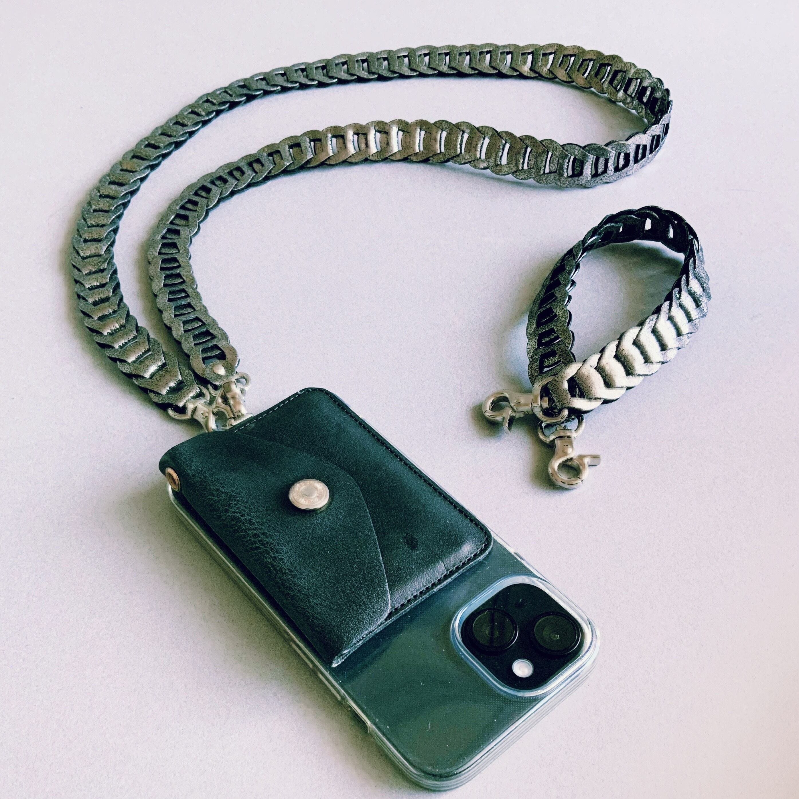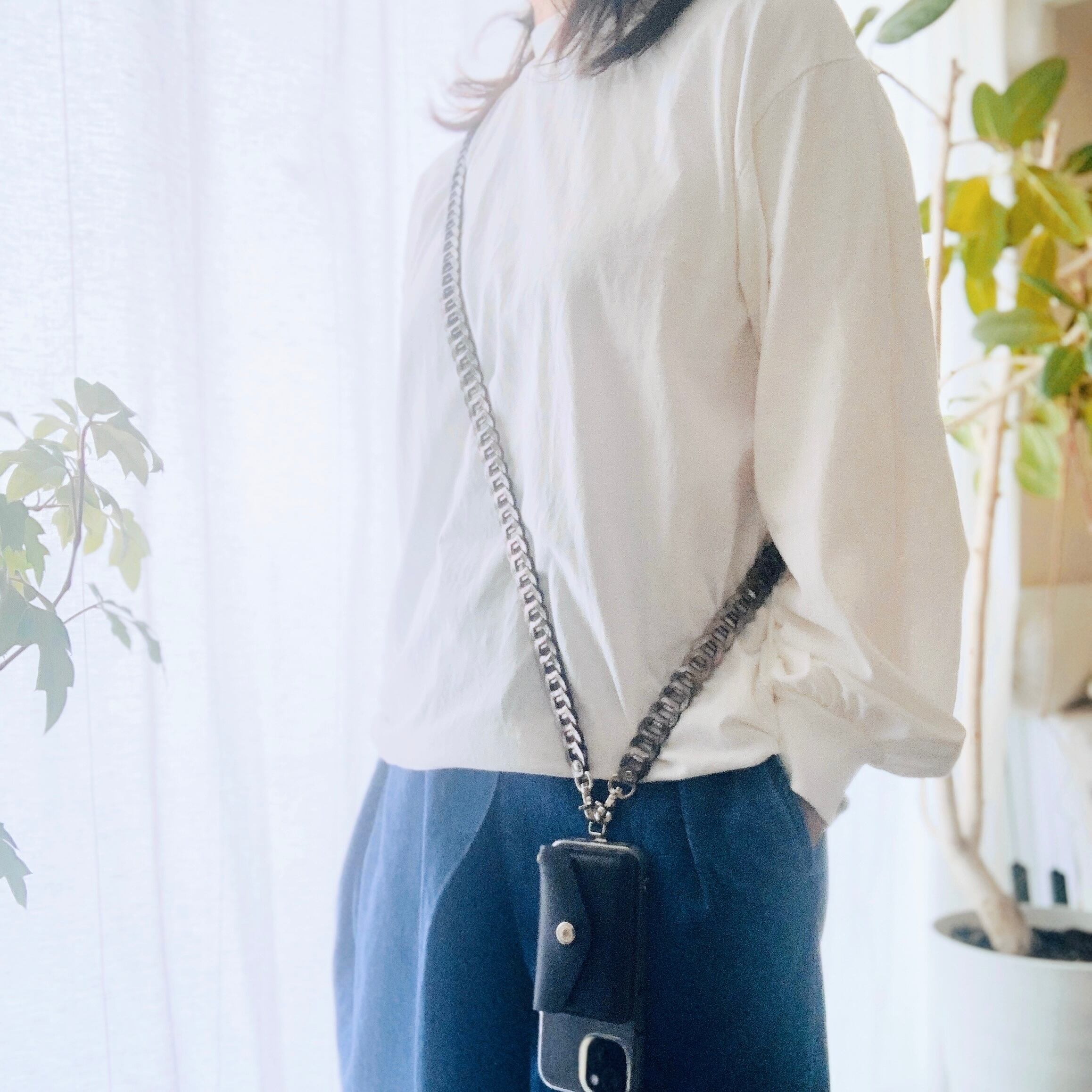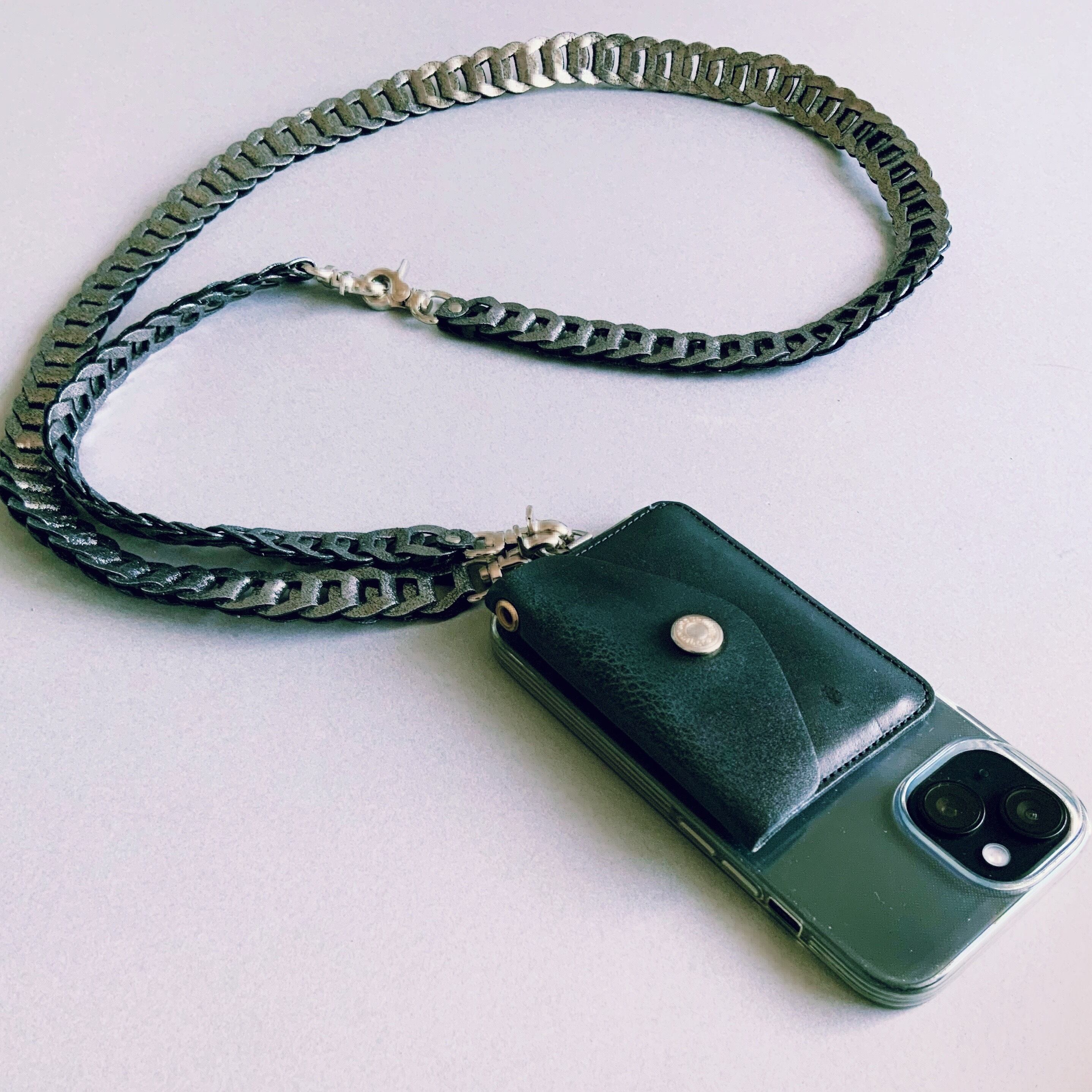 レザーのパーツを繋げた、スタイリッシュでマルチに使えるスマホショルダーストラップです。このアイテムはスマホショルダー、ネックショルダー、ハンドストラップの3通りの使い方ができ、あなたのライフスタイルにフィットします。