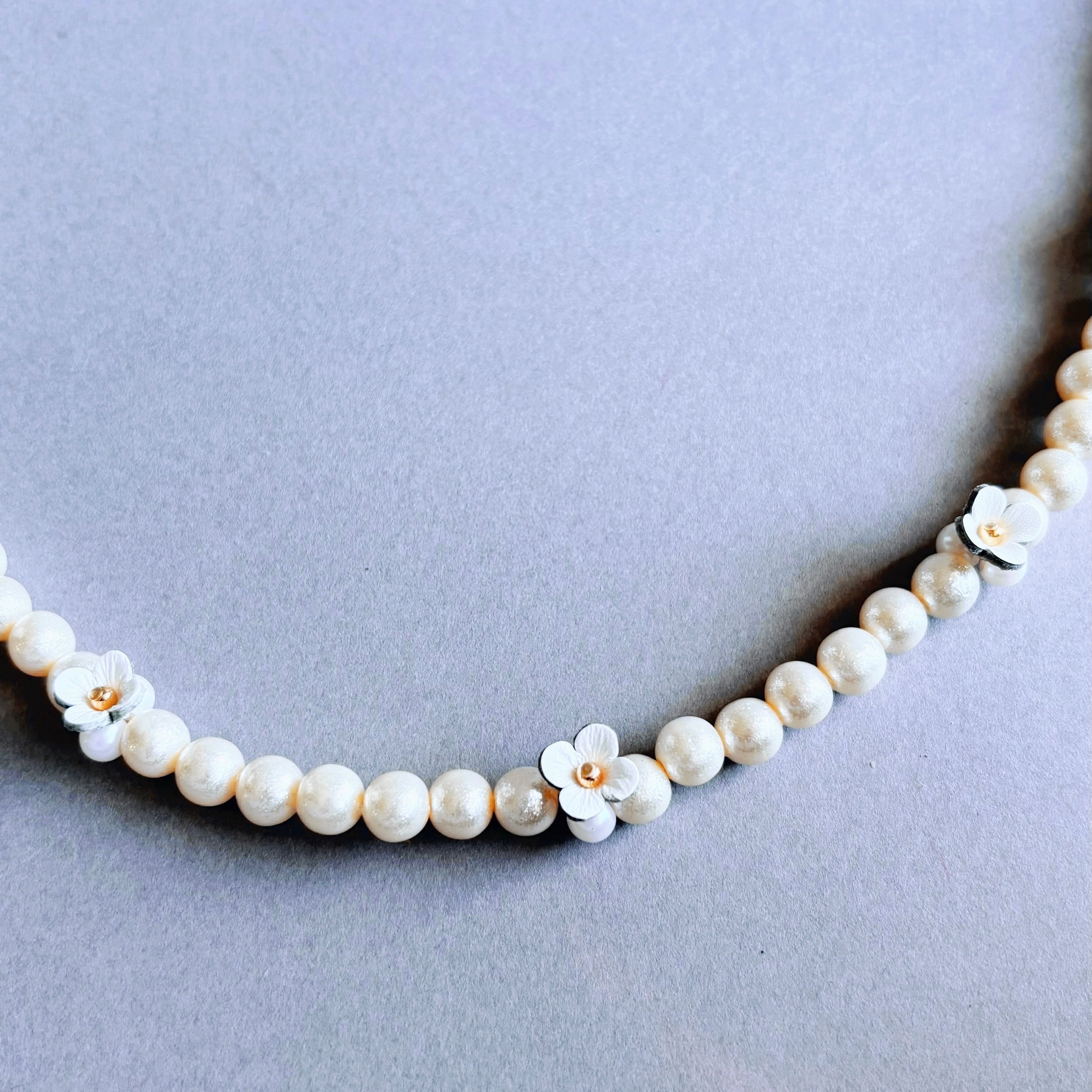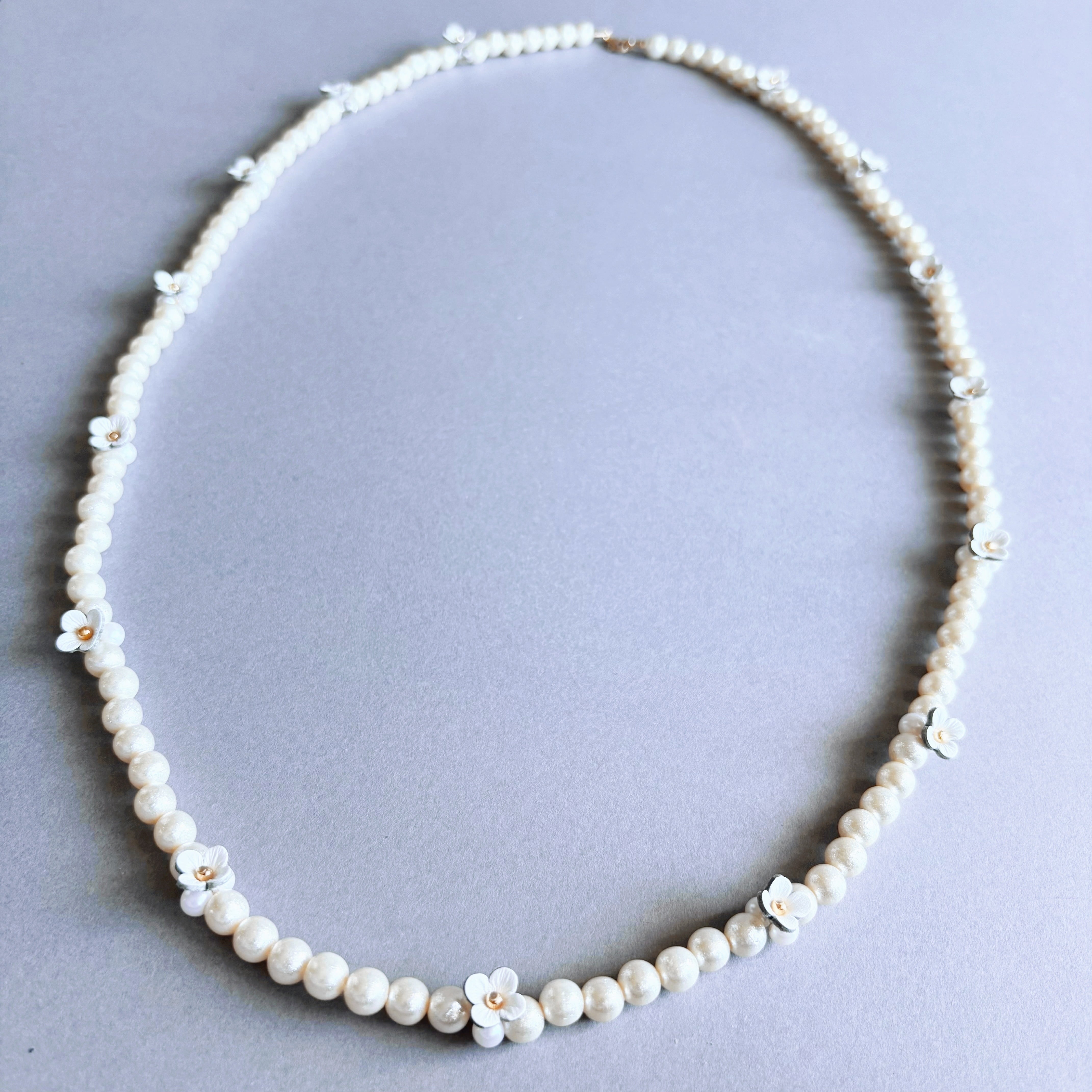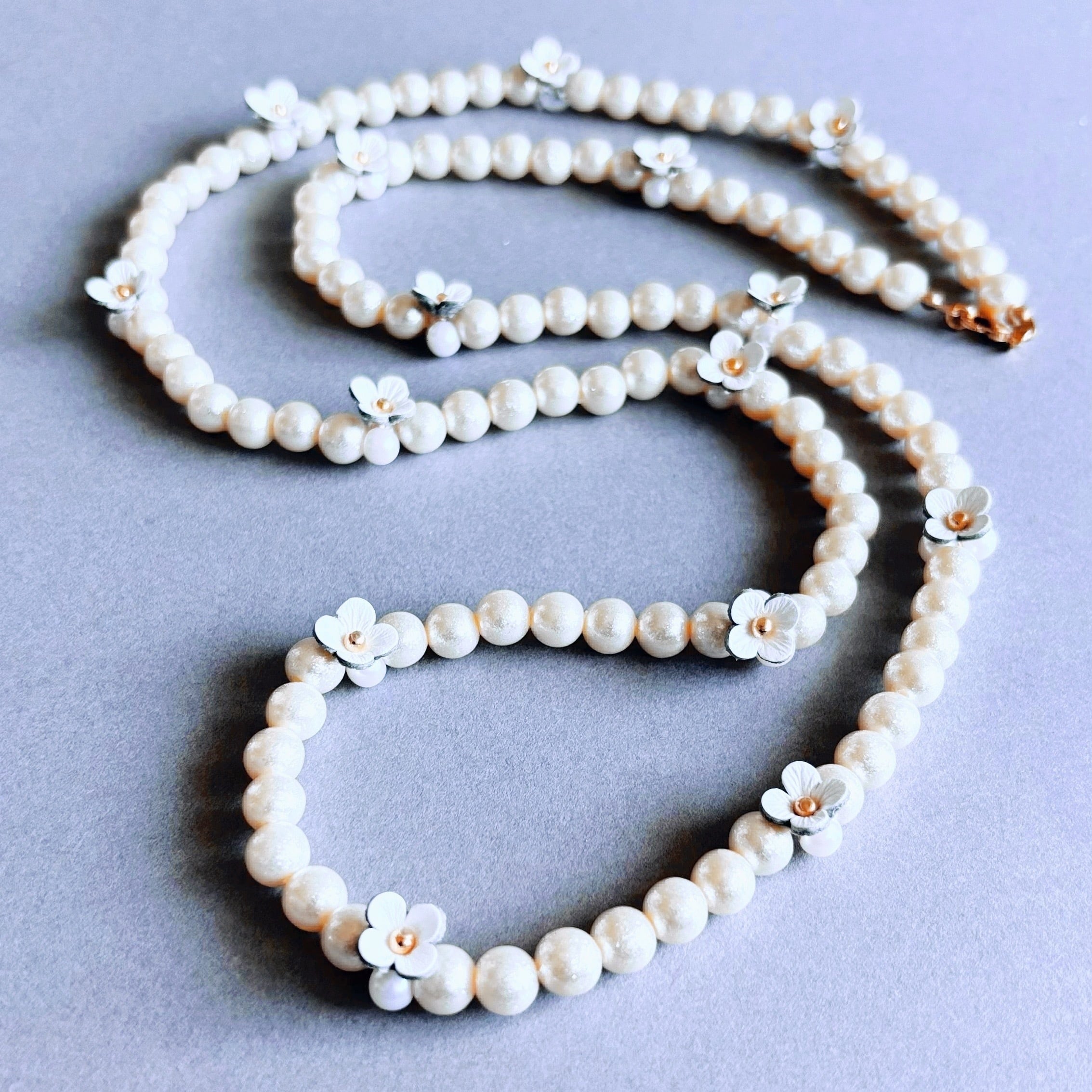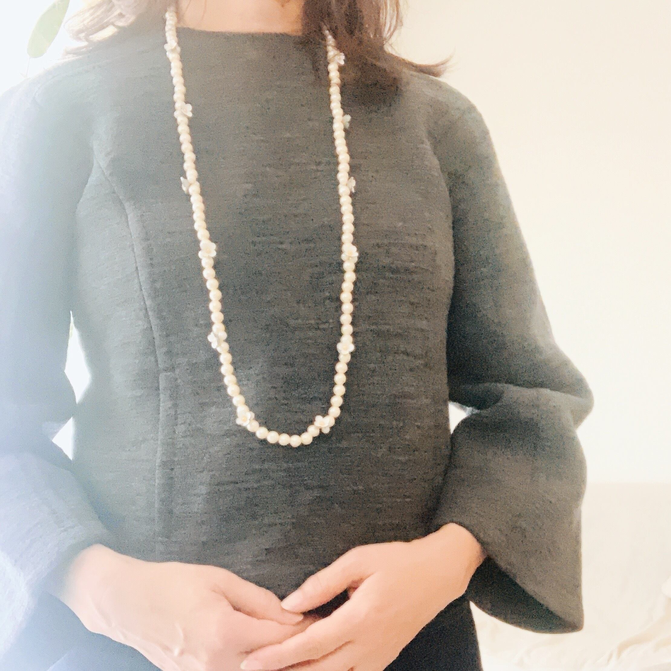 パールの間にレザーフラワーを散りばめたロングネックレスです。このアイテムは、シンプルな装いにアクセントを加えることで、特別なシーンにもぴったりです。