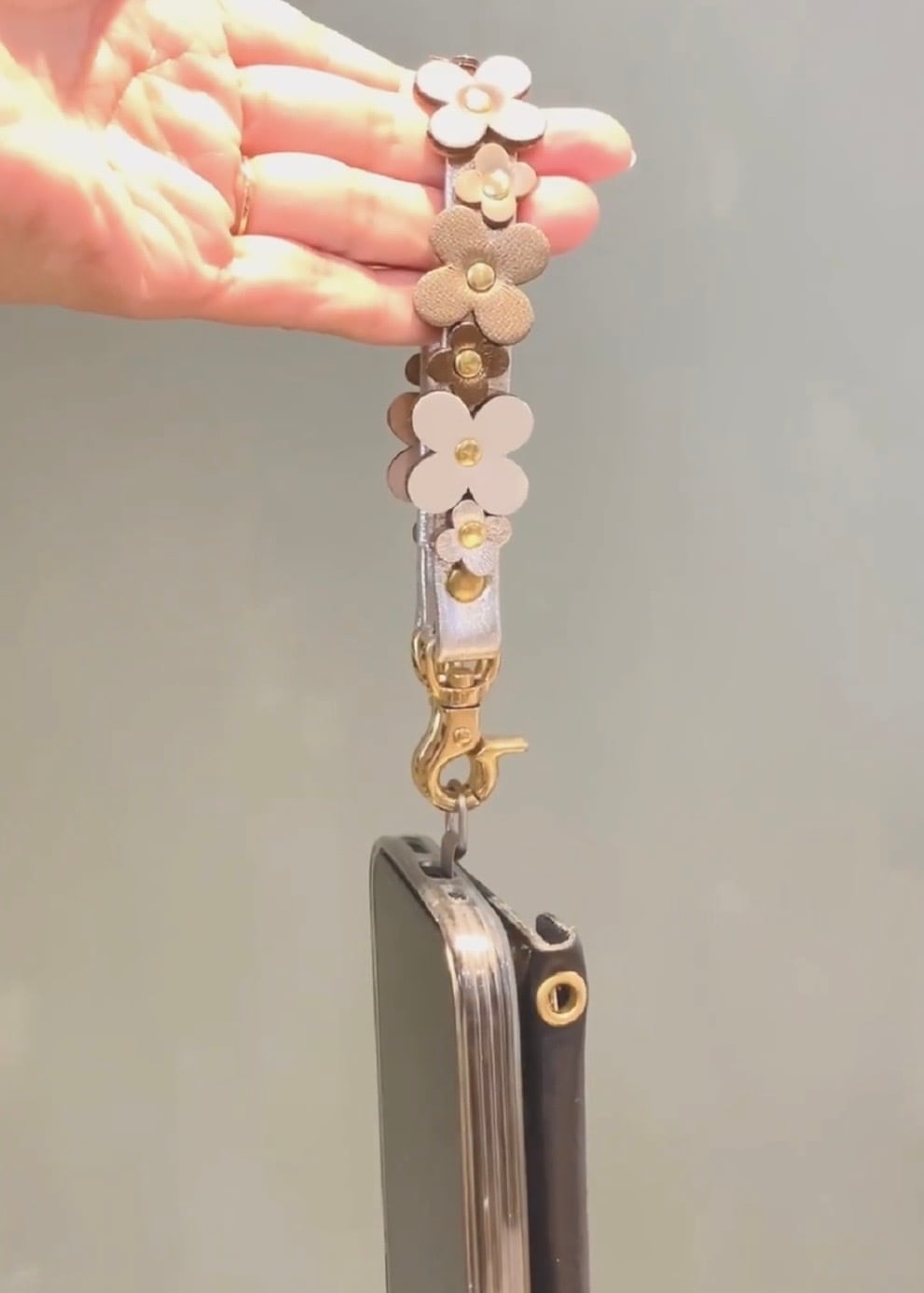 咲き並ぶレザーのお花が可愛い、ハンドメイドのスマホストラップ。
