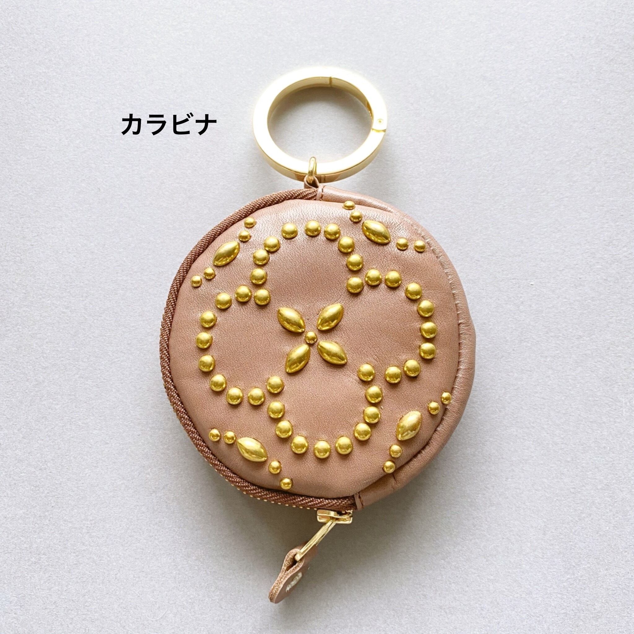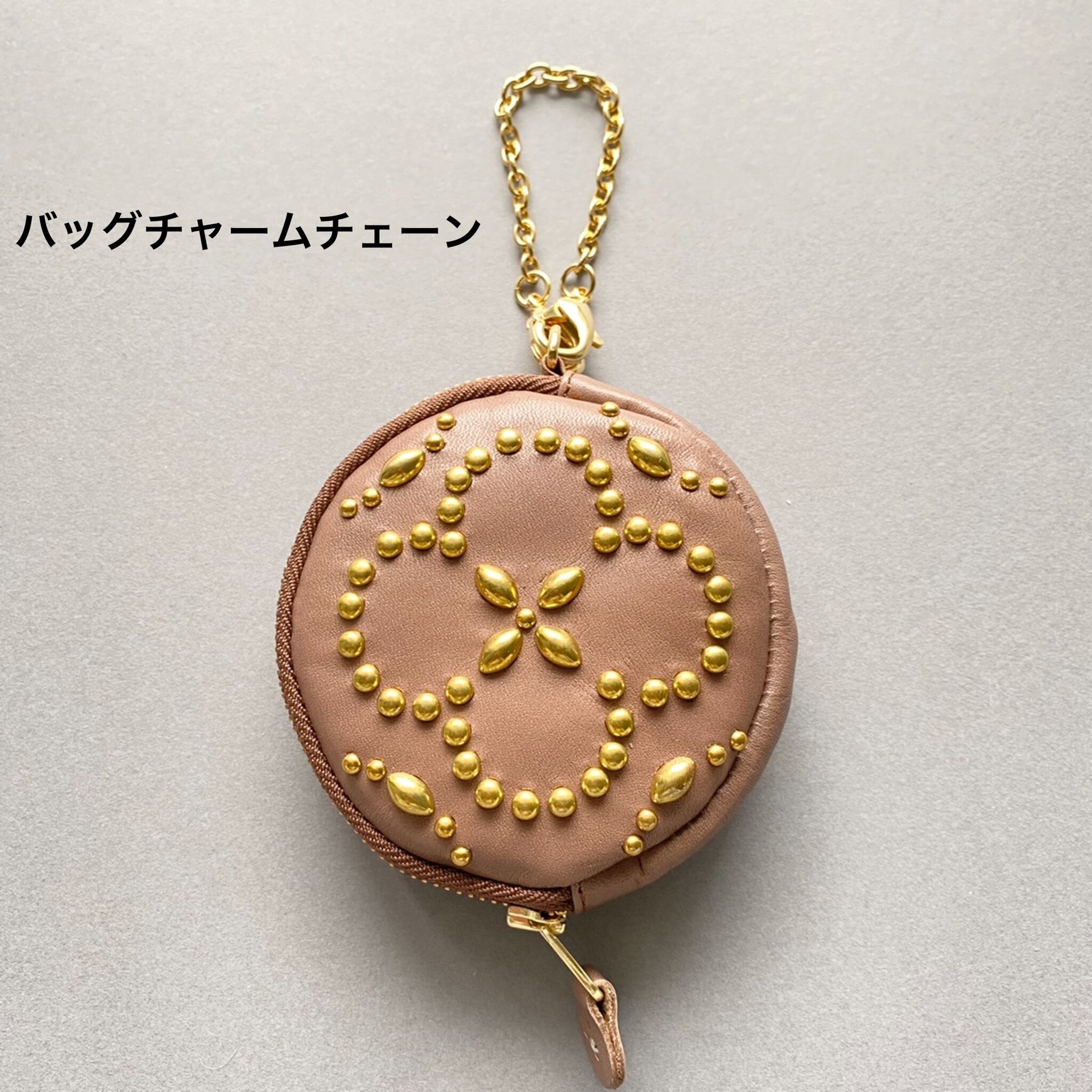 【金具が選べる】レザーラウンドポーチ(カフェオレ/ゴールドスタッズ)