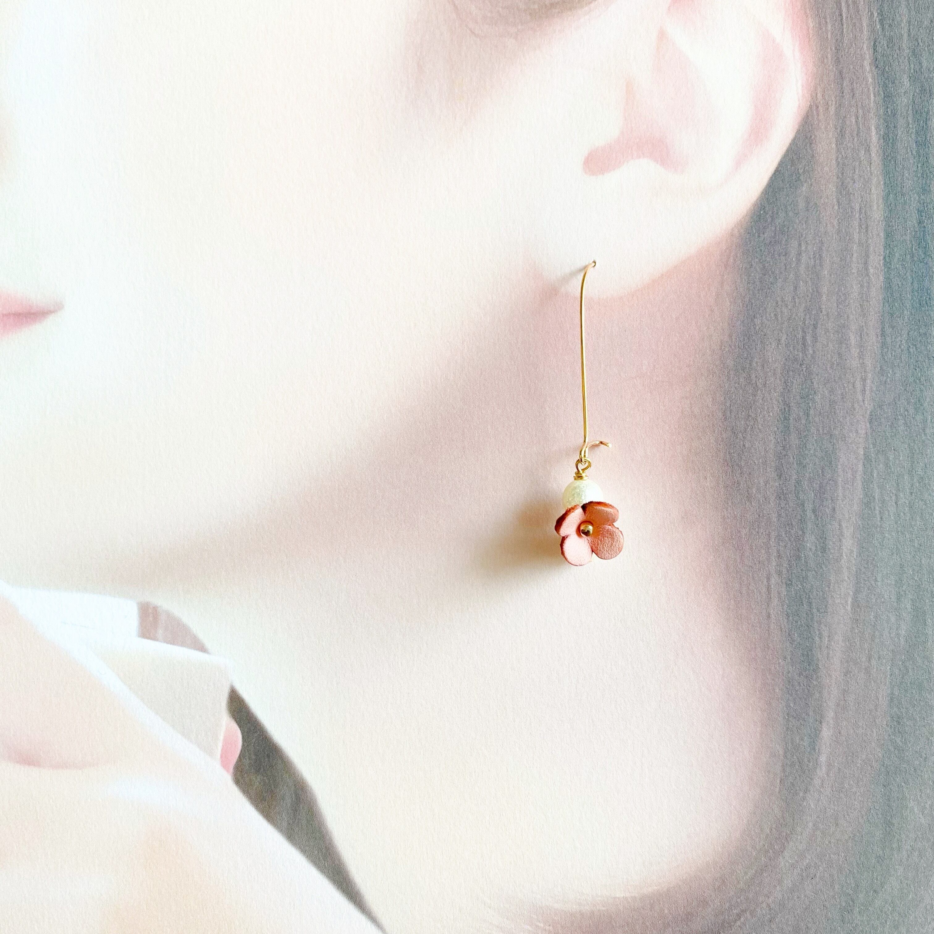 揺れ具合が可愛いスウィングピアスです。 マスクでも取れる心配のない形のピアス金具を使用してます。 《素材》牛革 真鍮 プラパール 《サイズ》5cm