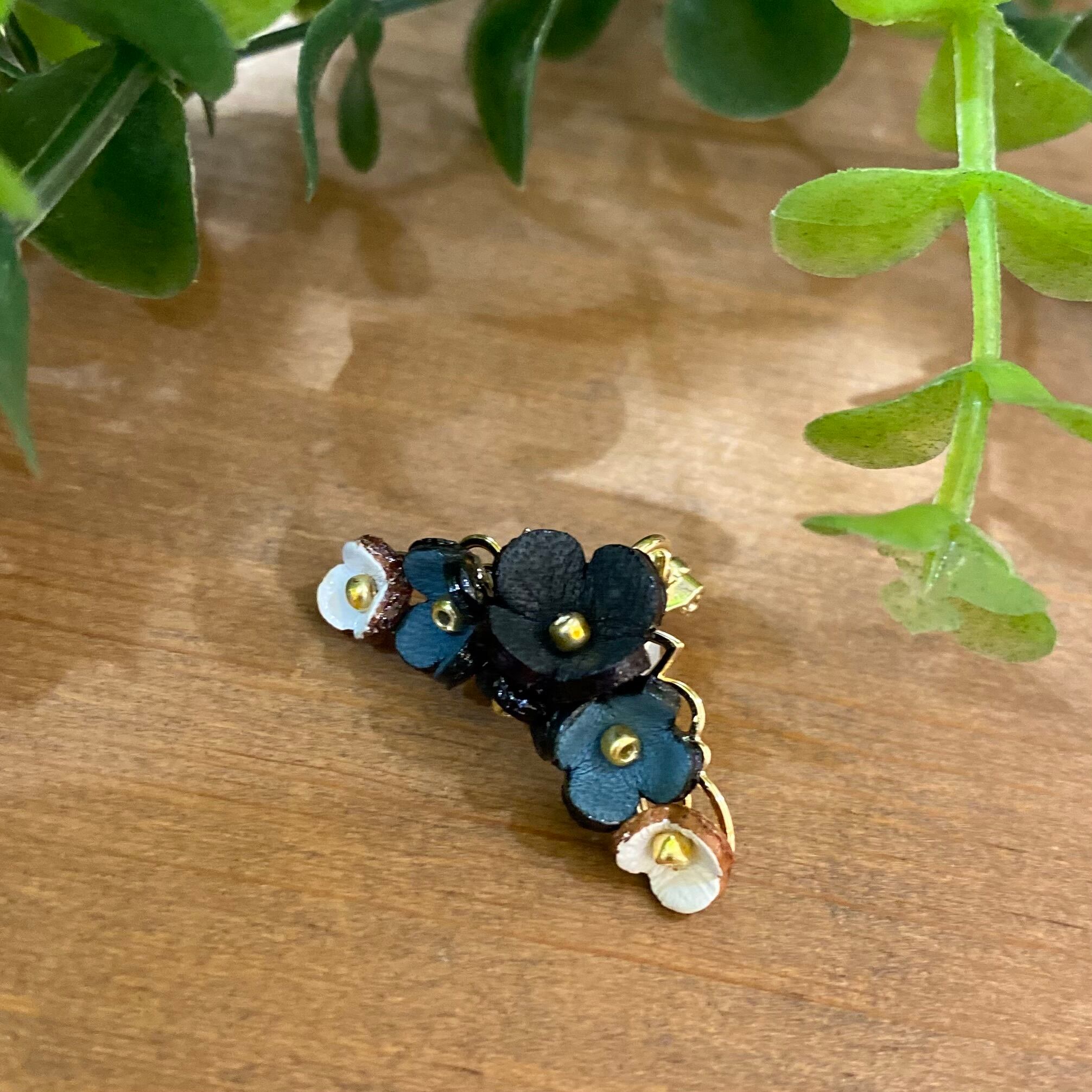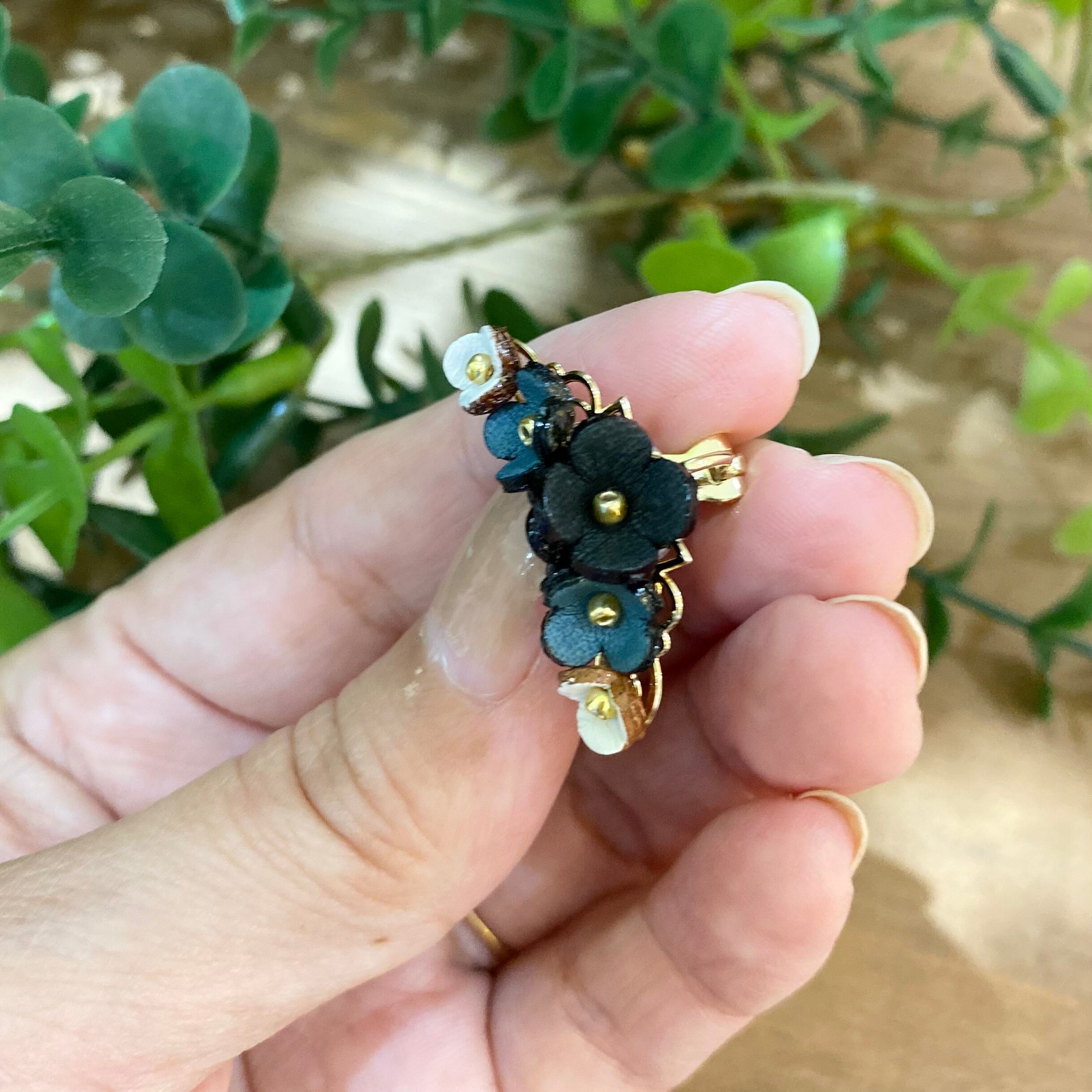 耳に沿って装着する、レザーフラワーが可憐なデザインのイヤーカフです。