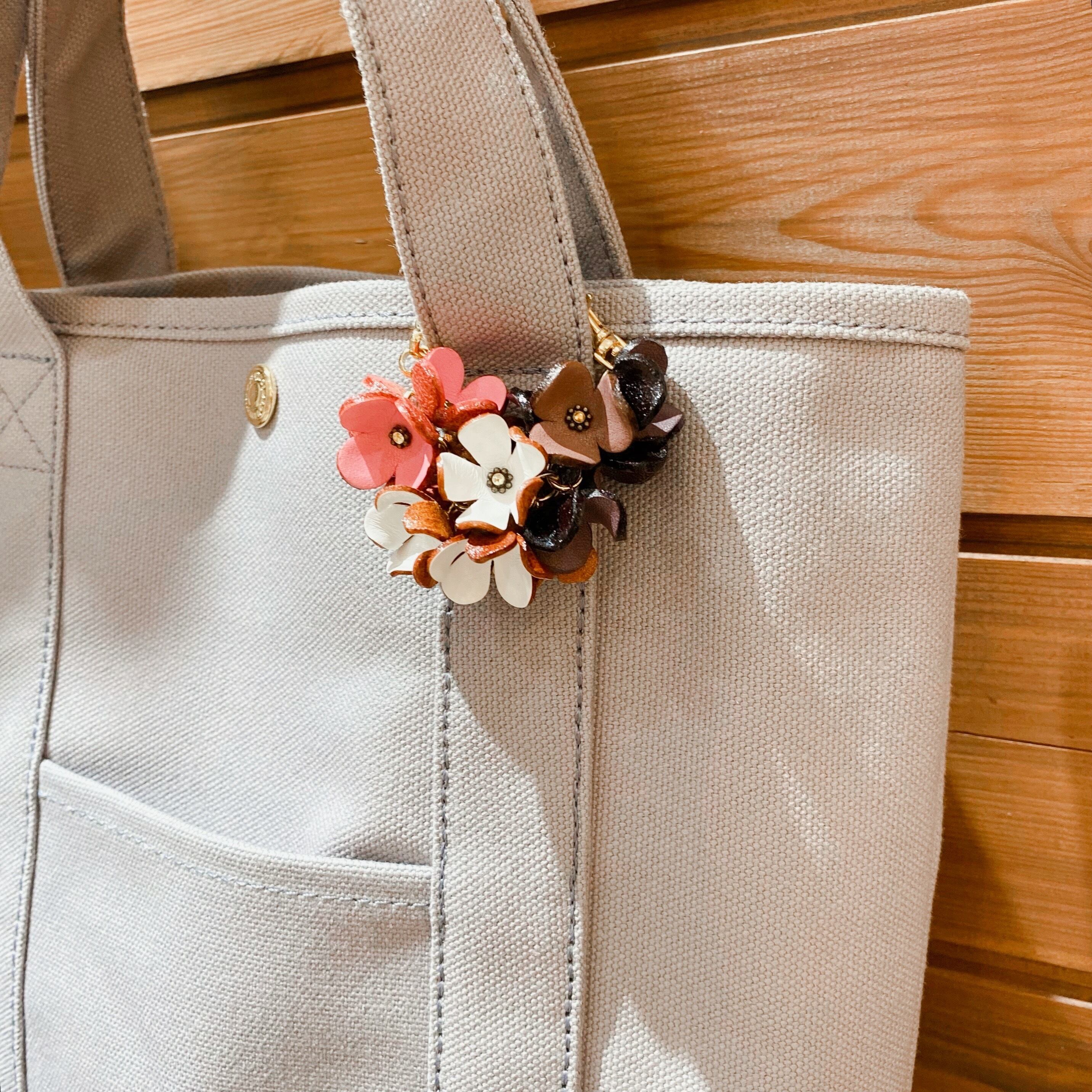 レザー製の花々が美しいフラワーレイバッグチャームはバッグに素敵な変化を与えます。