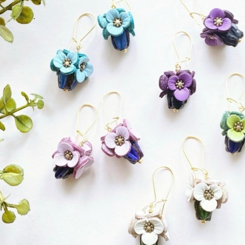 可憐なデザインのスミレピアスは、スミレをイメージしたレザーフラワーピアスです。